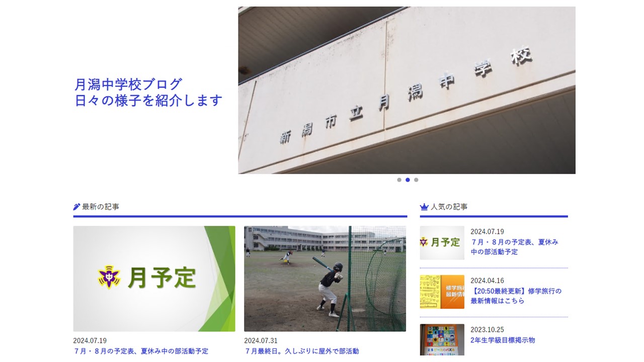 新潟市立月潟中学校は、新潟市南区にある公立中学校です。このホームページでは、学校概要や予定表、たよりなどをお知らせしています。スマートフォンからご覧いただいている方は、上部にあるメニューボタンをタップしてください。 また、公式ブログでは日々の様子をお伝えしています。下の画像をクリックしてご覧ください。